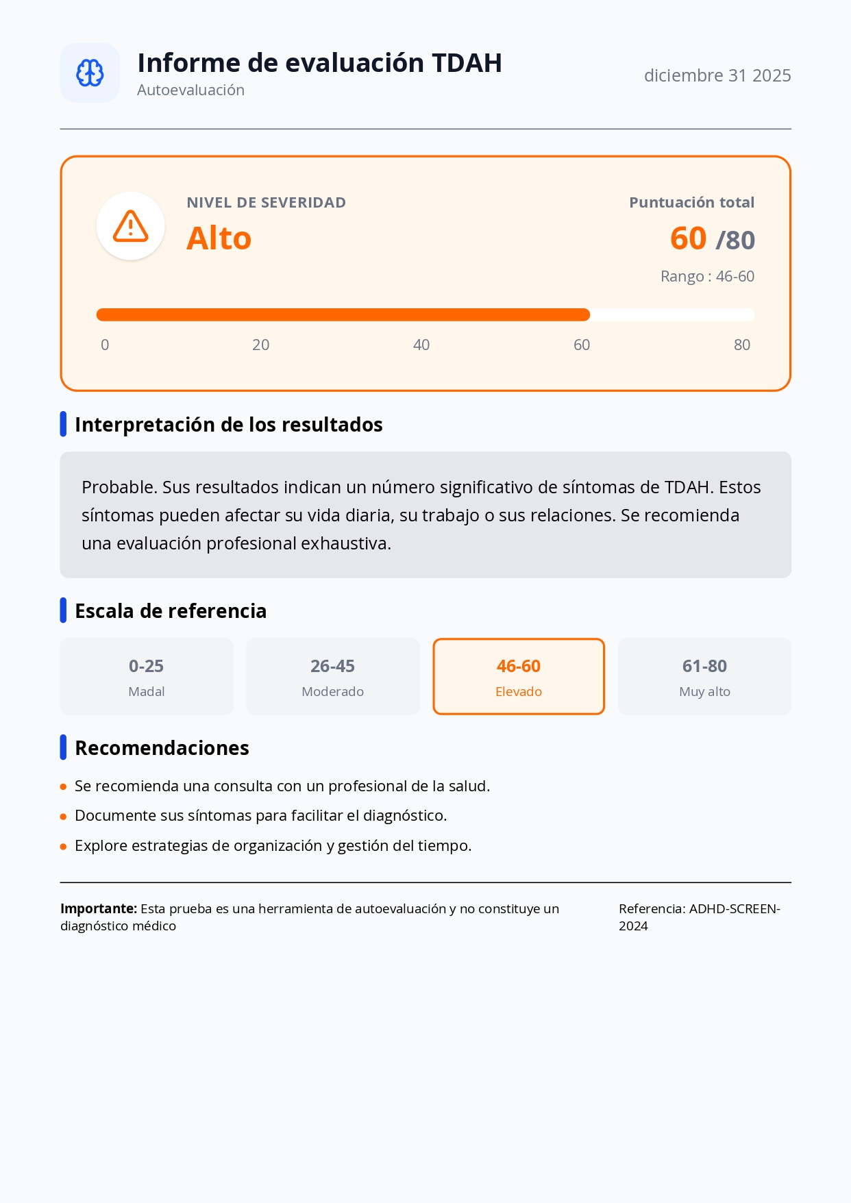 Este cuestionario está destinado únicamente a fines educativos. Solo un profesional de la salud está autorizado a realizar un diagnóstico de TDAH. Le recomendamos encarecidamente que consulte con su médico de cabecera para discutir sus resultados y su situación personal.