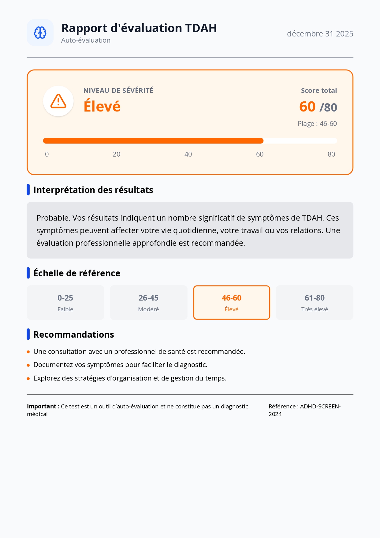 Ce questionnaire est destiné à des fins éducatives. Seul un professionnel de santé est habilité à poser un diagnostic de TDAH. Nous vous recommandons vivement de consulter votre médecin traitant pour discuter de vos résultats et de votre situation personnelle.