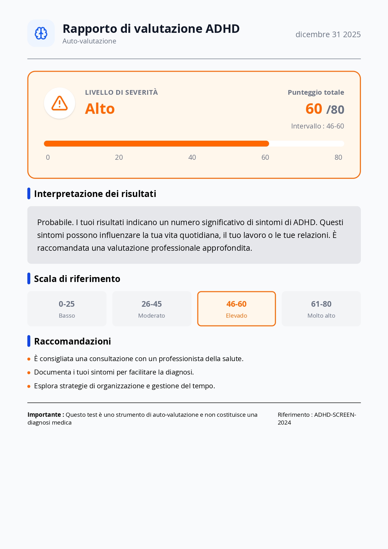 Questo questionario è destinato esclusivamente a scopi educativi. Solo un professionista sanitario è autorizzato a formulare una diagnosi di ADHD. Ti consigliamo vivamente di consultare il tuo medico di base per discutere i tuoi risultati e la tua situazione personale.